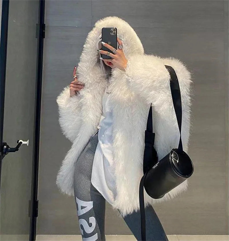 Abrigo piel sintética mujer coreano 2024. Diseño capucha pelo zorro, medio largo grueso, estilo streetwear. Perfecto otoño-invierno. Moda red.