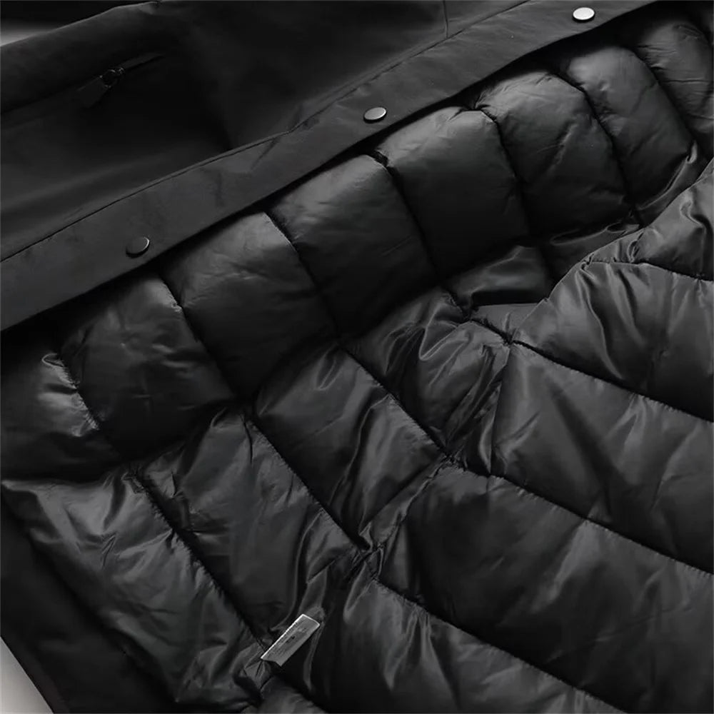 Abrigo elegante para mujer estilo europeo y americano, diseñado para esquí y clima frío. Capucha cálida y cintura ajustada para un look favorecedor.