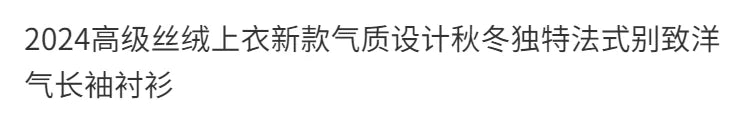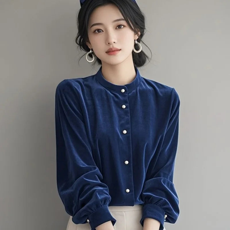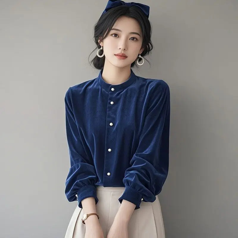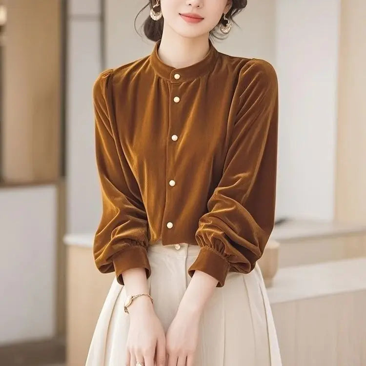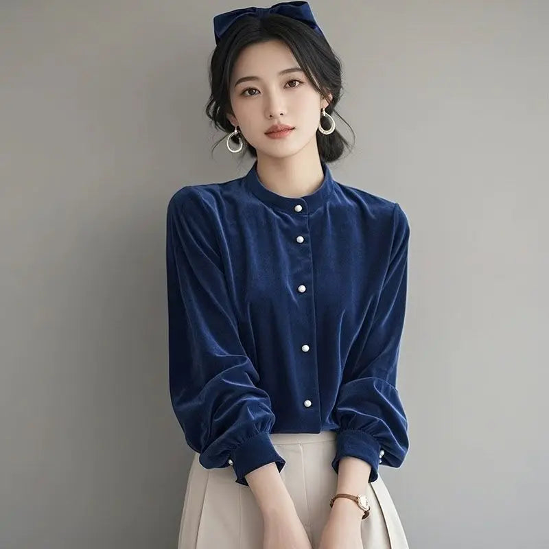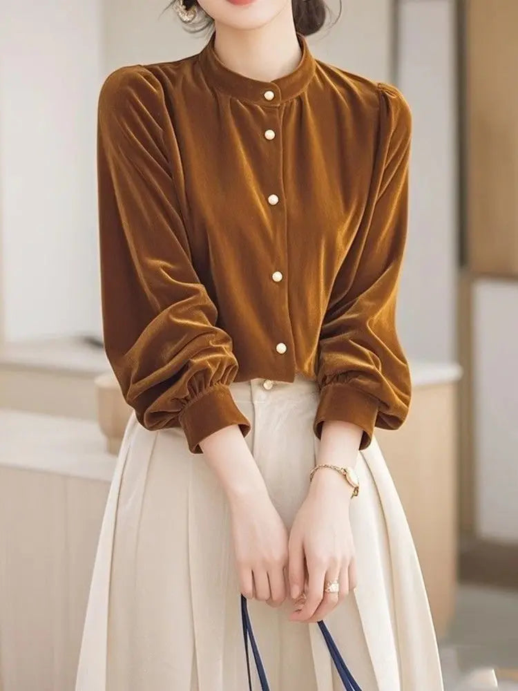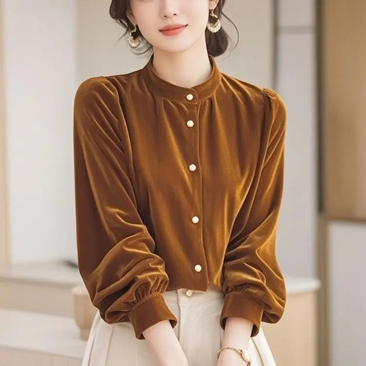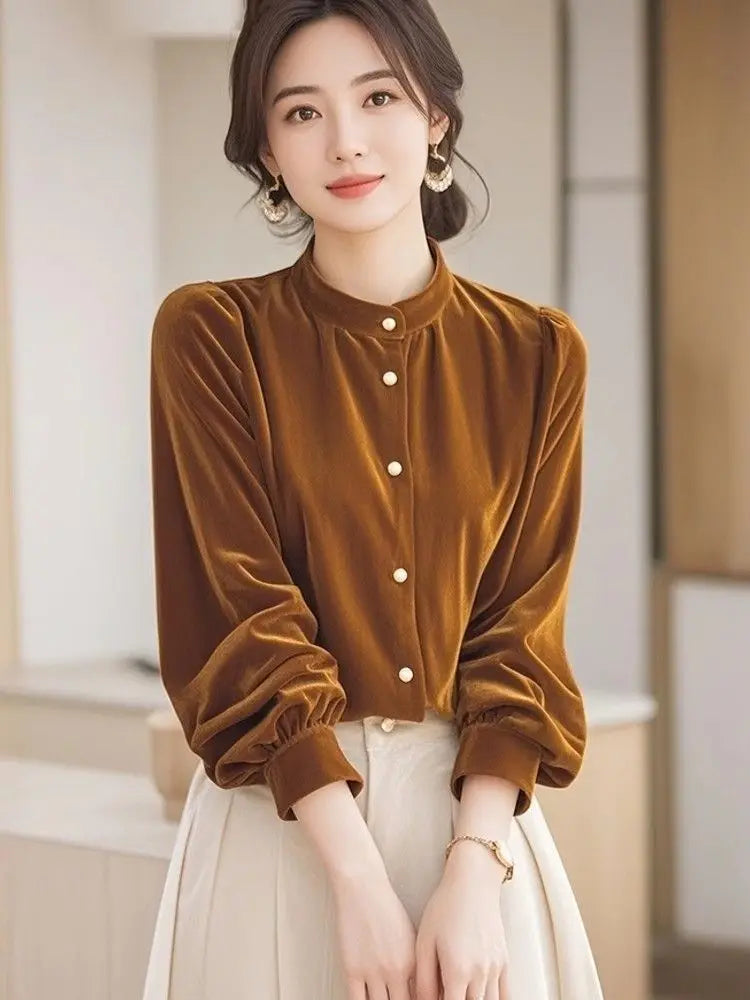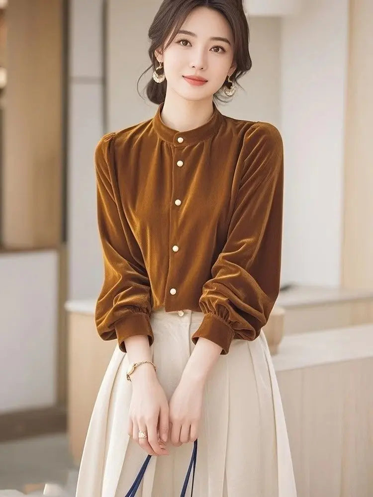 Top terciopelo mujer temperamento 2025. Diseño francés único, manga larga chic, estilo otoño-invierno. Perfecto nuevo. Elegancia francesa.