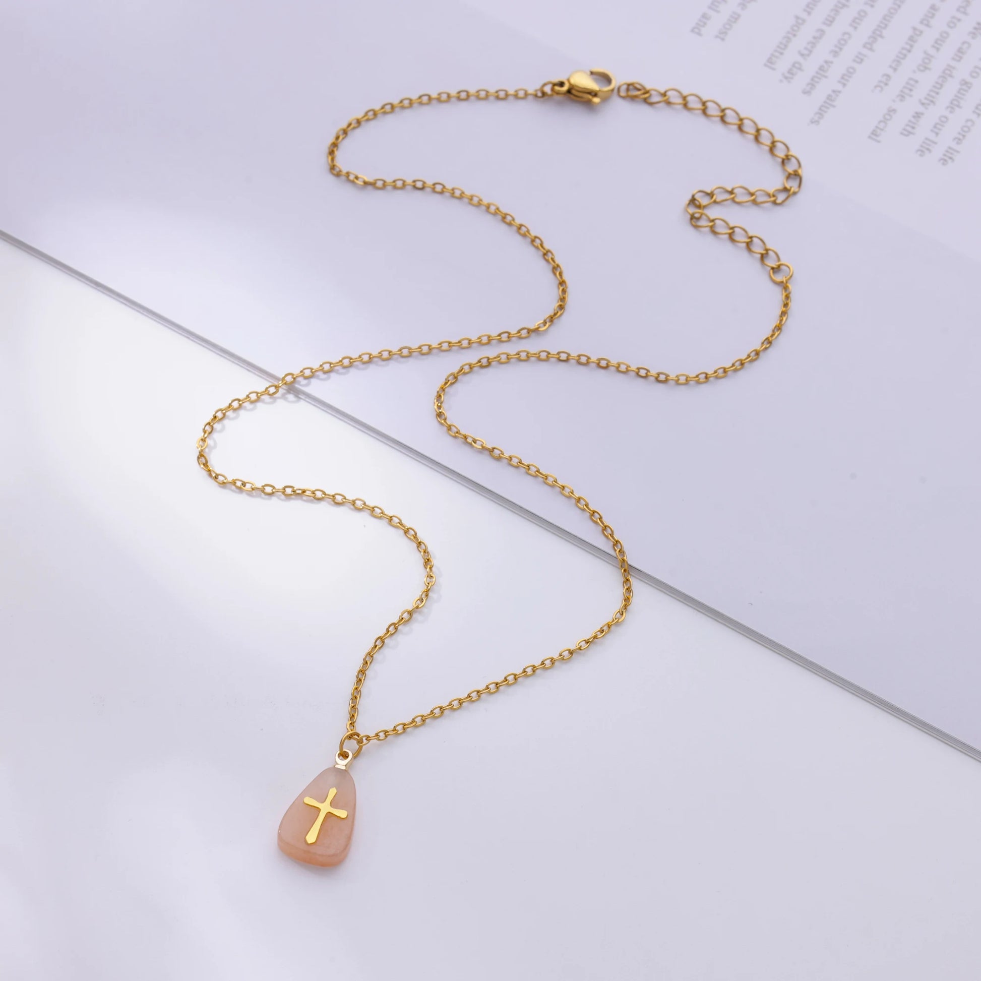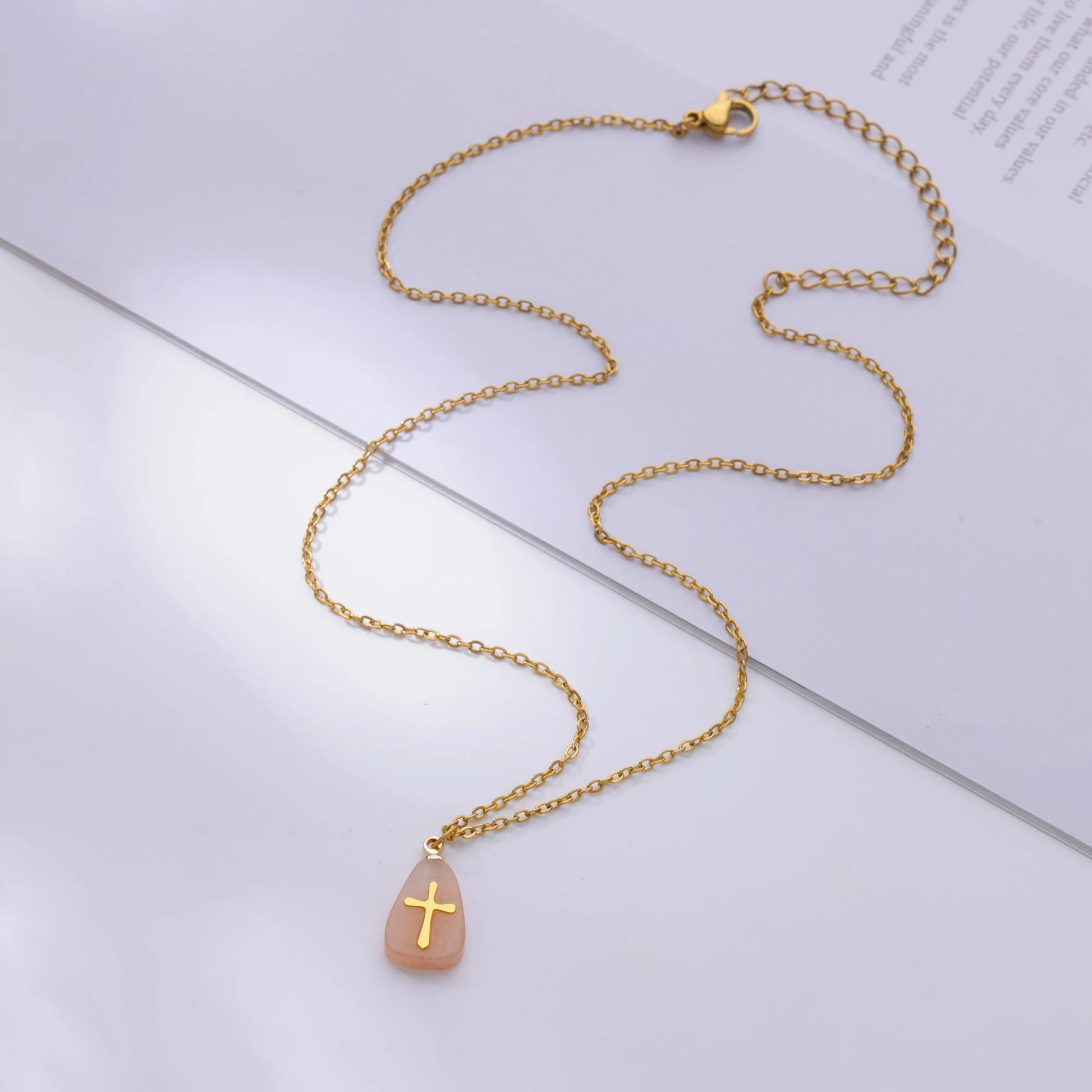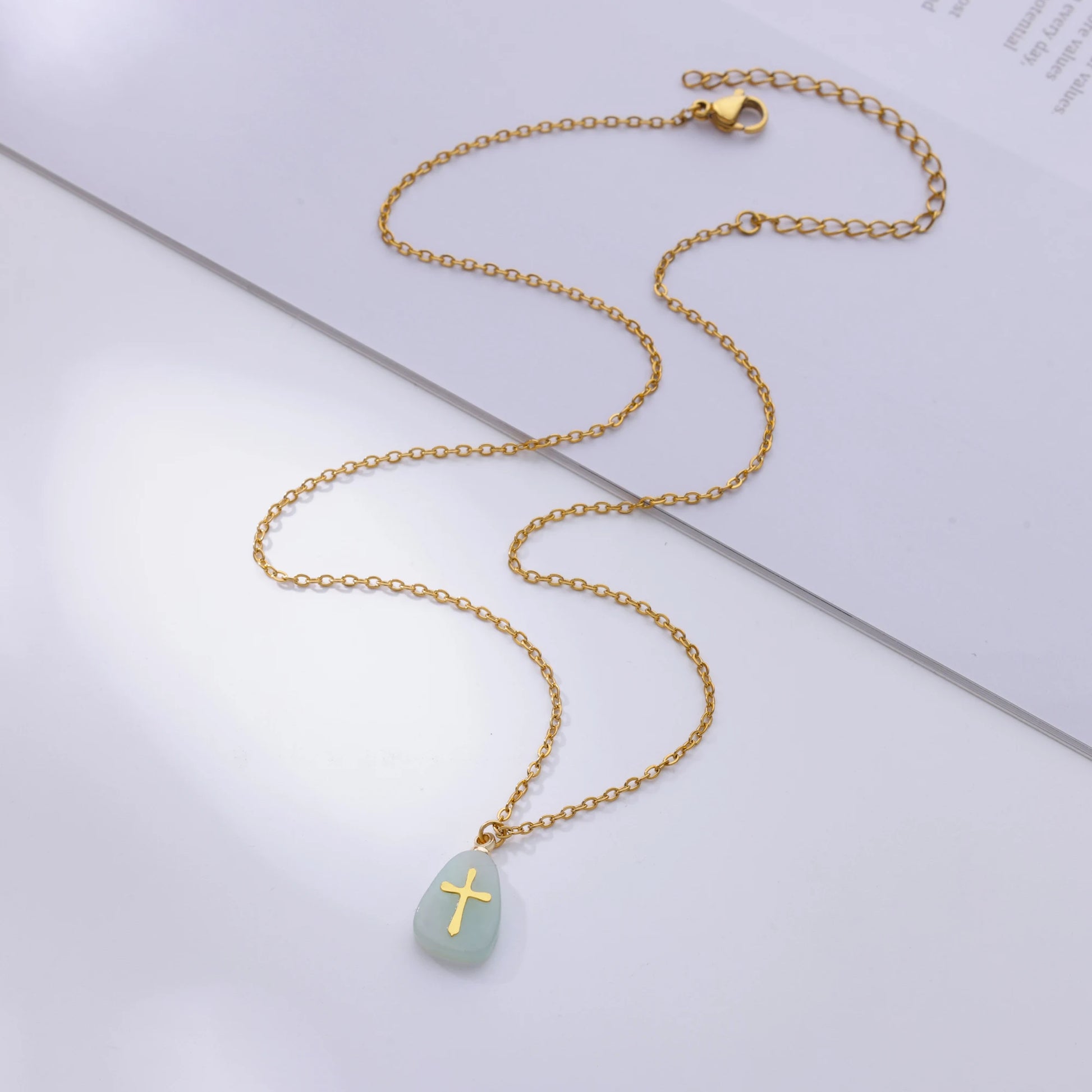 Brilla con este hermoso collar con colgante de cruz adornado con piedras coloridas. Diseño elegante en acero inoxidable con acabado dorado perfecto para la mujer moderna.