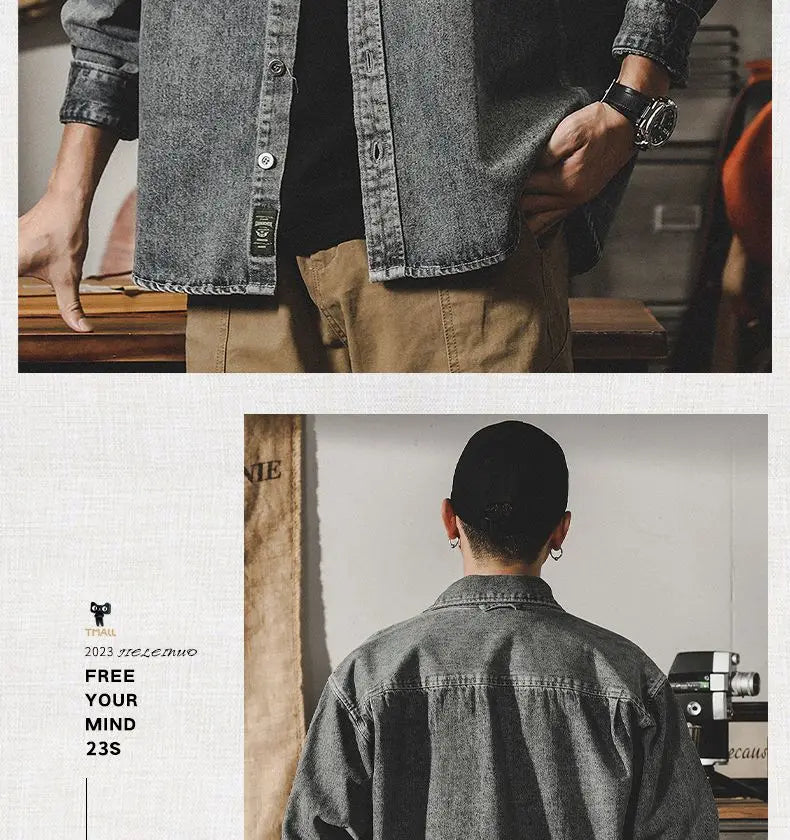 Camisa denim masculina retro nueva. Diseño casual tipo chaqueta de trabajo perfecta para primavera y otoño, manga larga azul clásica.