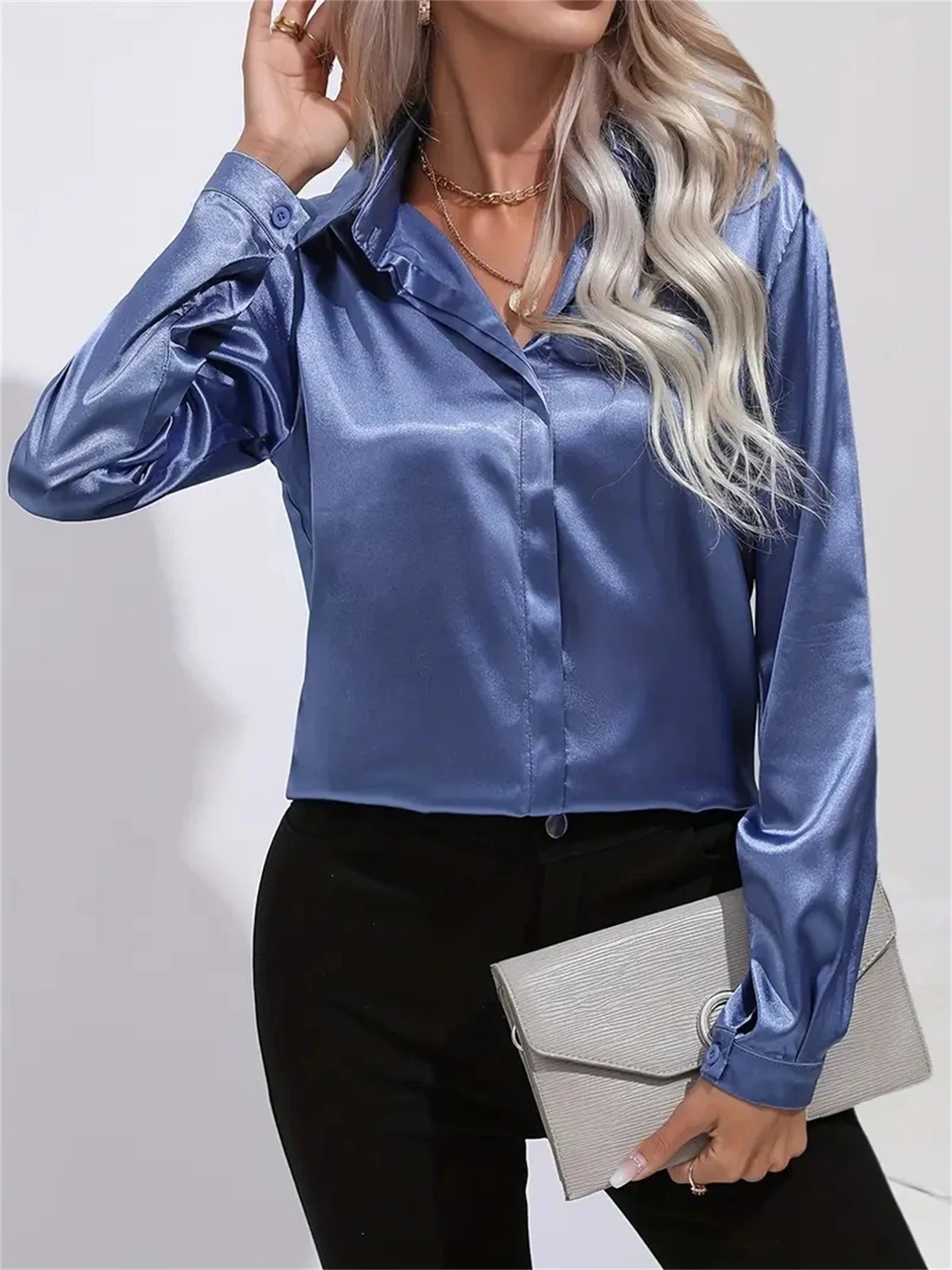 Descubre la camisa de satén con cuello y botón que redefine la elegancia profesional. Con manga larga y diseño sofisticado, esta blusa es perfecta para la mujer moderna que busca estilo en la oficina.