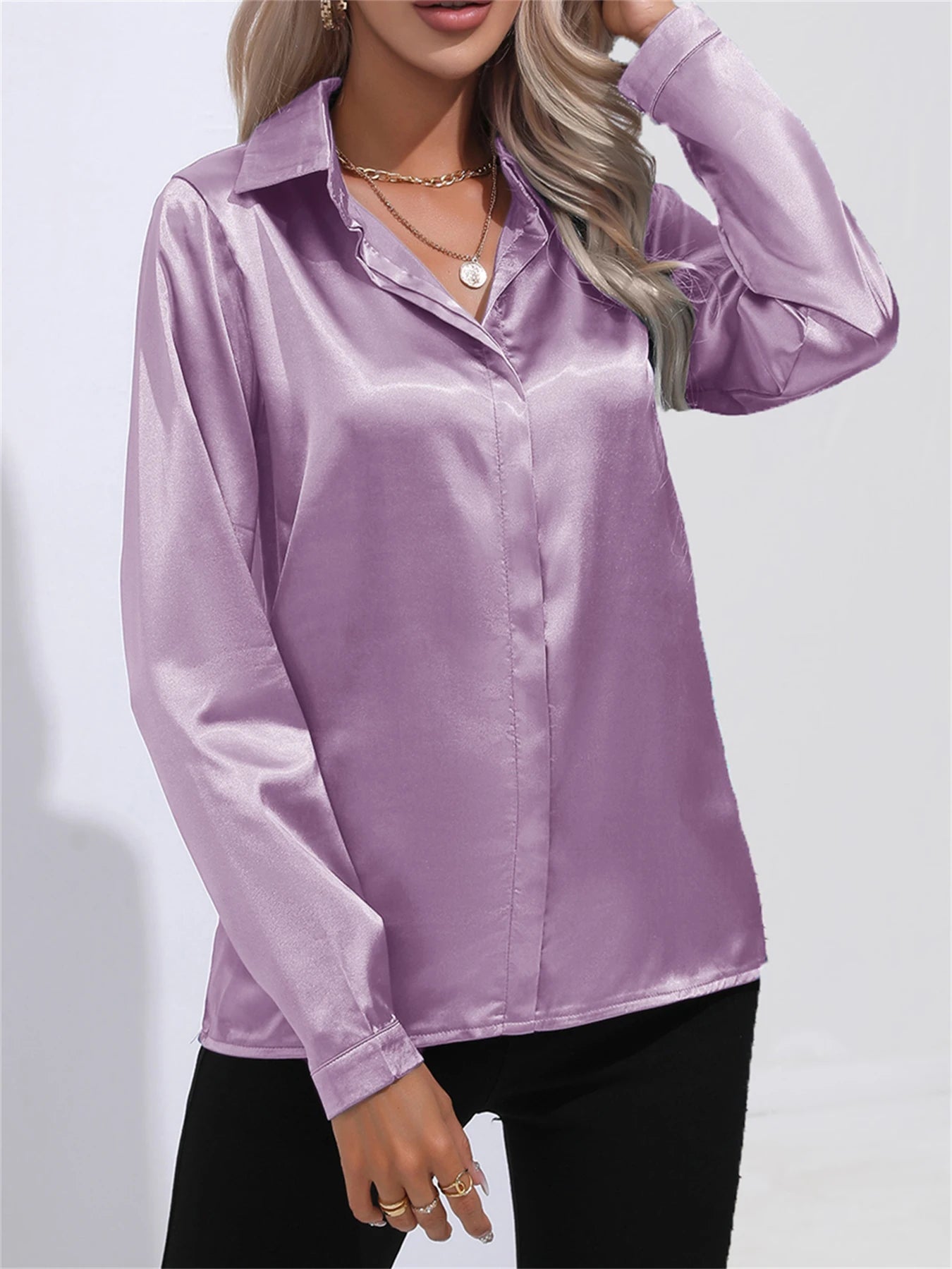 Camisa Satén Mujer Oficina - Blusa Cuello Botón Manga Larga