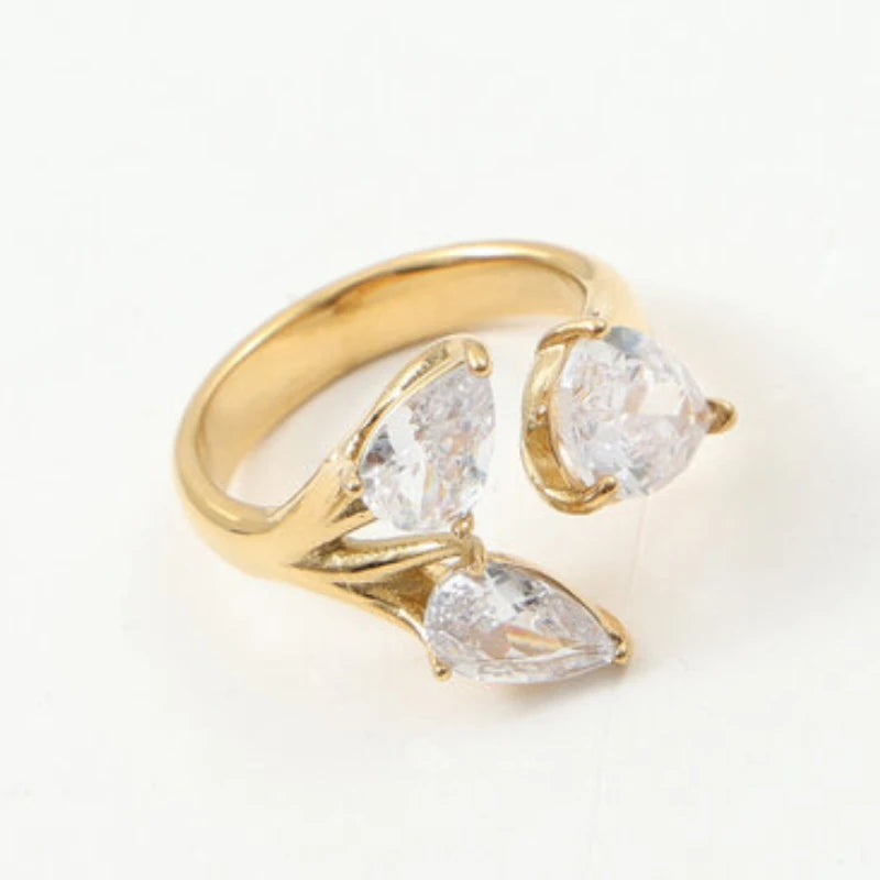 Destaca con este elegante anillo con tres circonitas en forma de gota de agua. Diseño premium con tecnología PVD impermeable.
