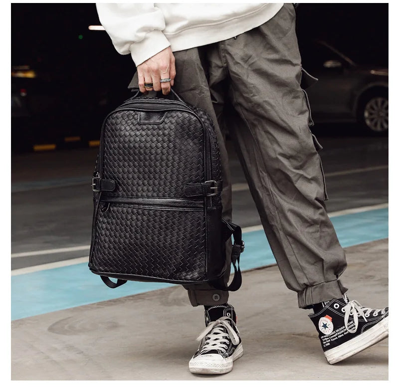 Lujo artesanal con esta mochila vintage de cuero cordero. Diseño tejido suave perfecto para portátil, viajes y uso unisex.