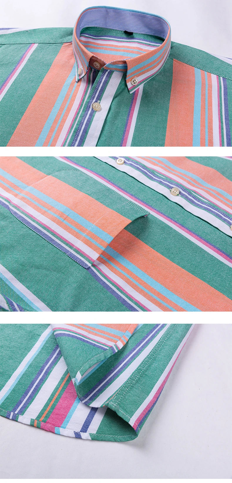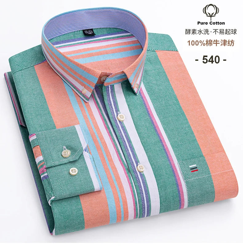 Camisa casual de algodón puro Oxford con rayas. Manga larga con bolsillo, suave y abotonada, perfecta para looks formales y casuales. Disponible en tallas grandes.
