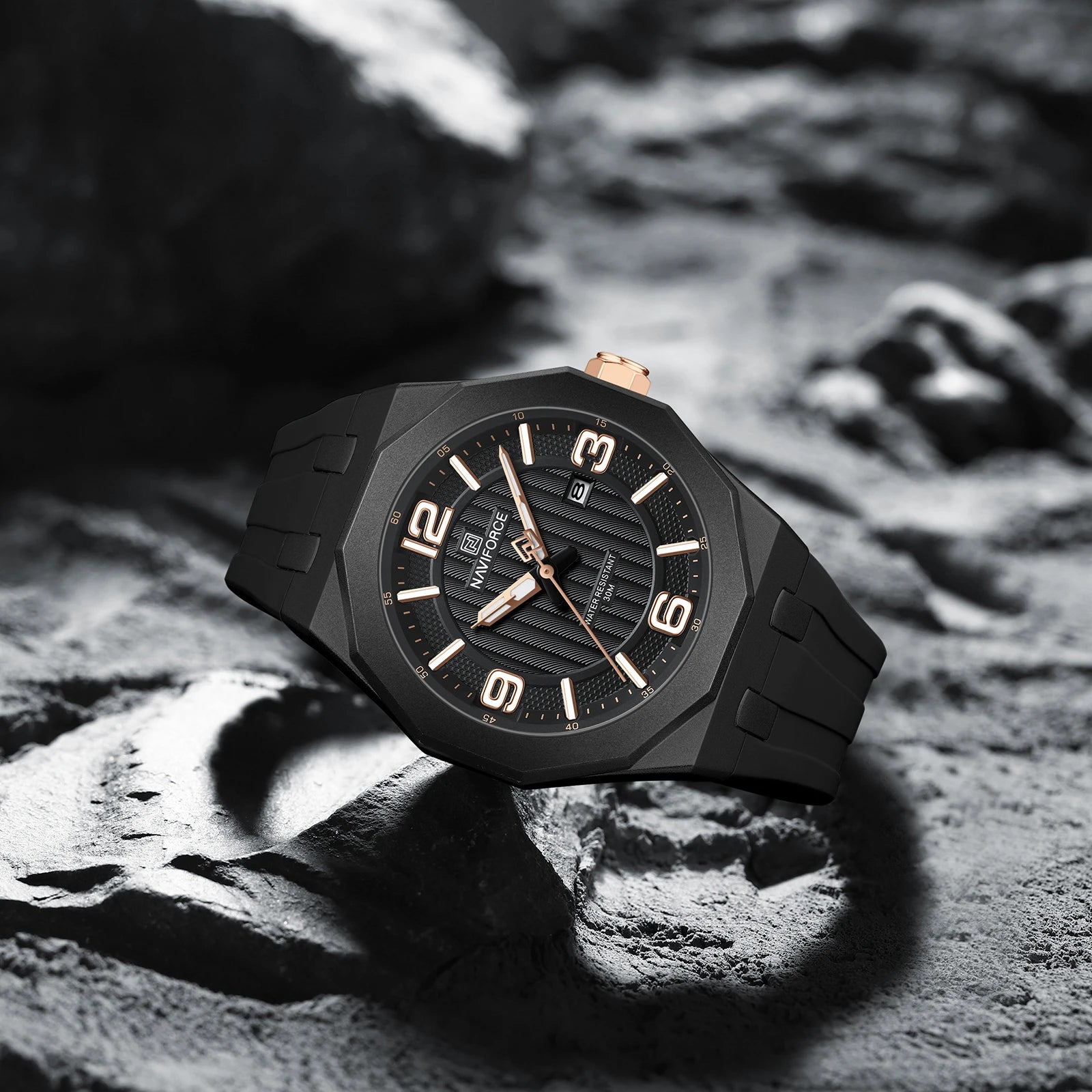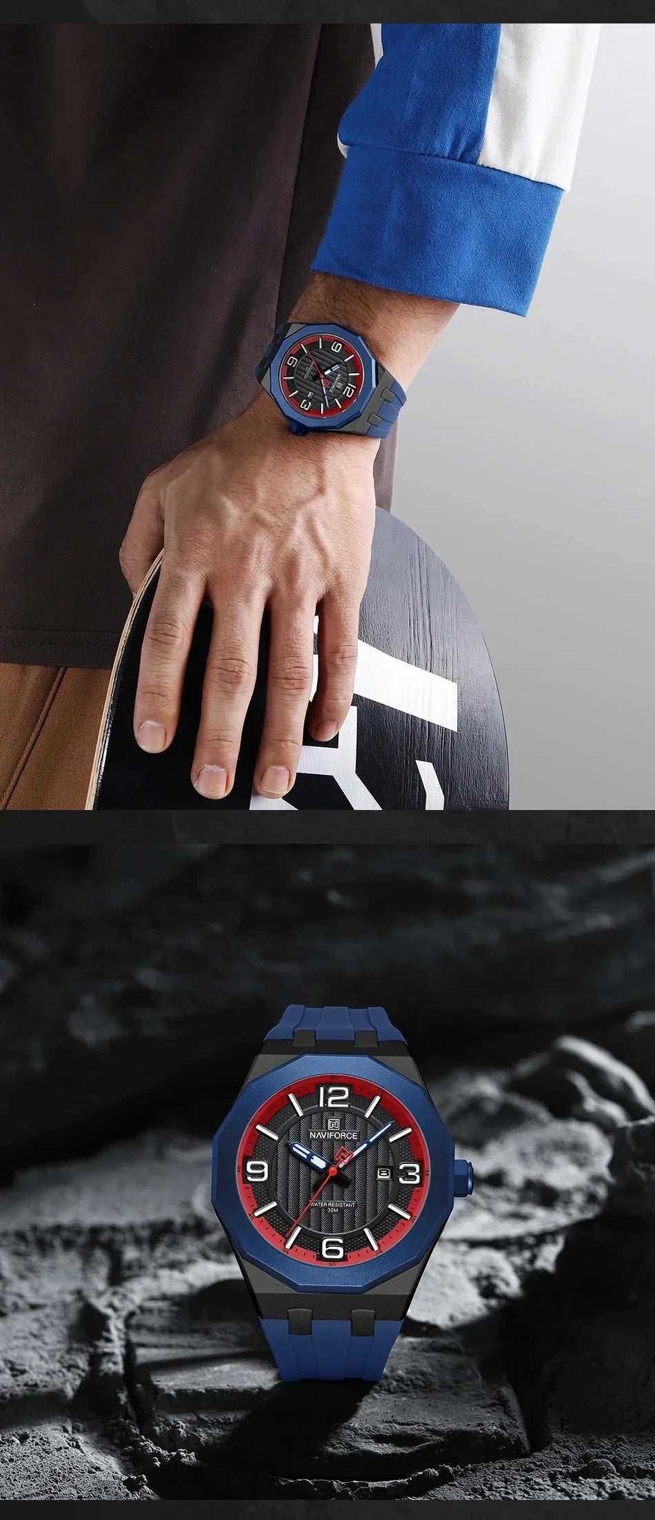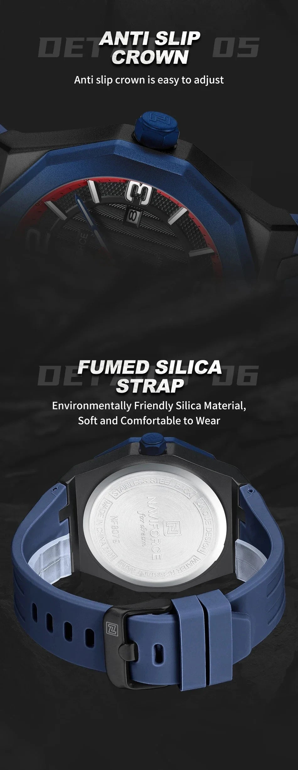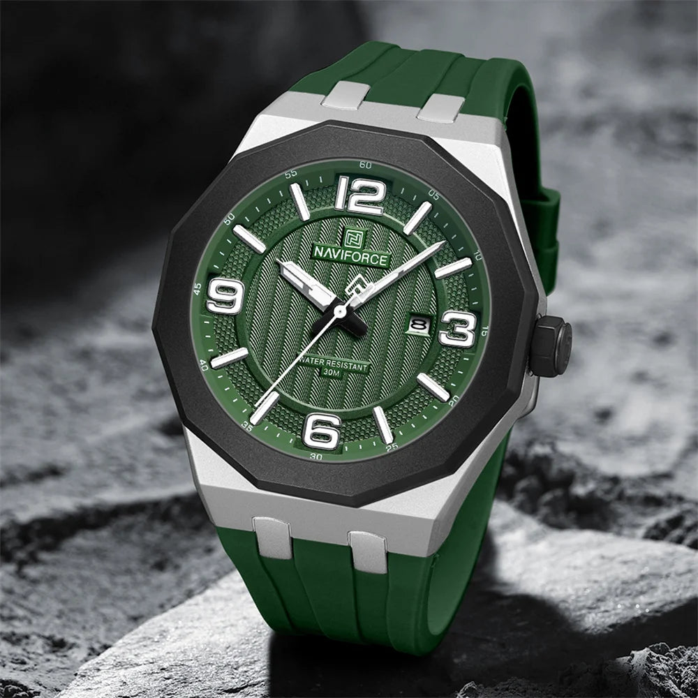 Comodidad y estilo para tu día a día. El NAVIFORCE 8079 con correa de silicona es perfecto para el hombre activo y moderno.