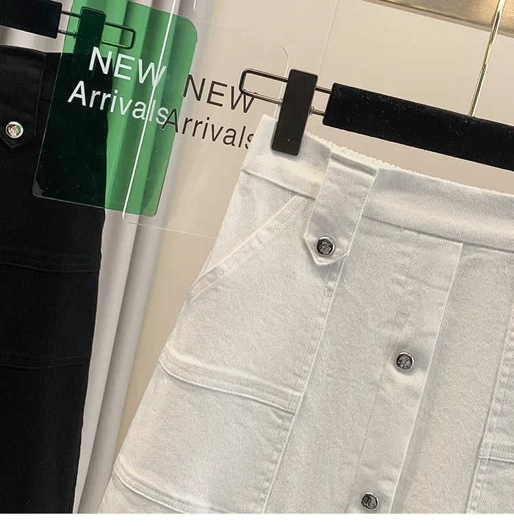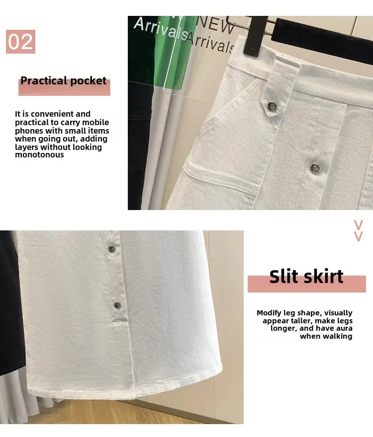 Estilo casual con esta falda de denim tallas grandes. Diseño midi con cintura alta elástica perfecta para primavera-verano.