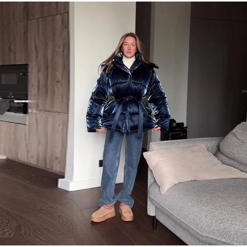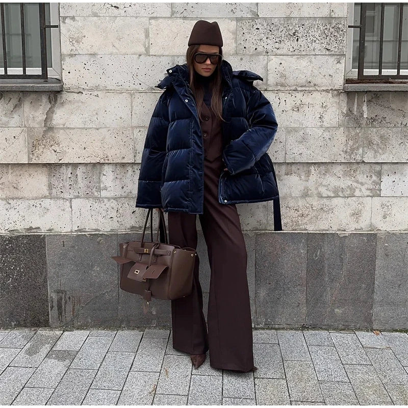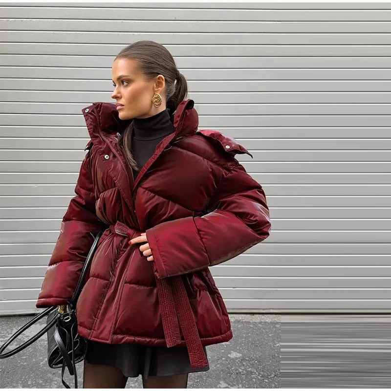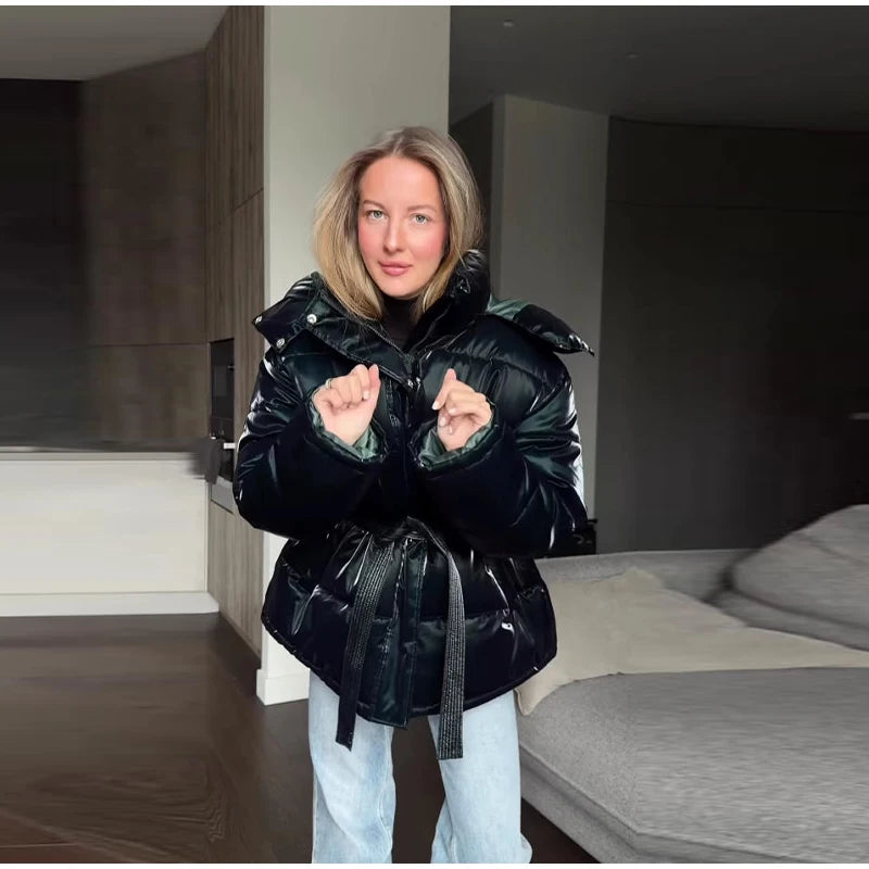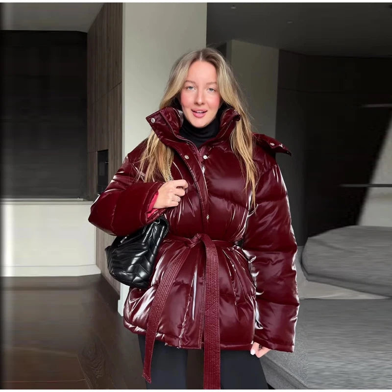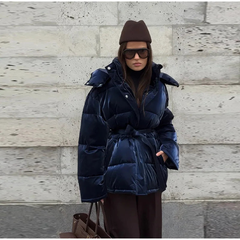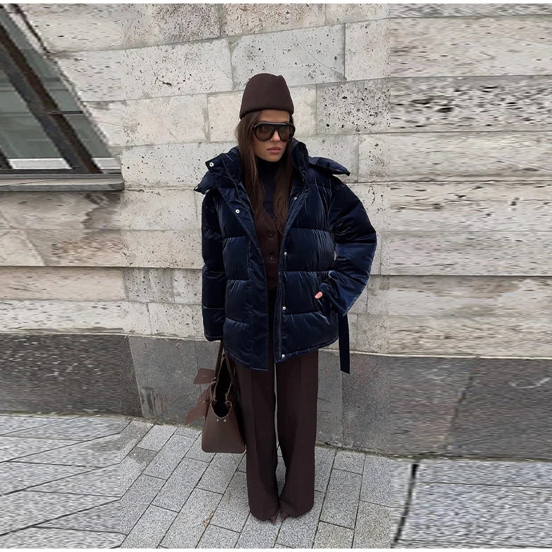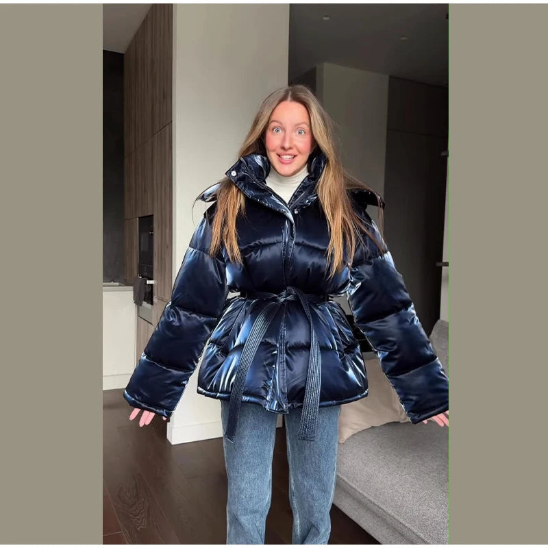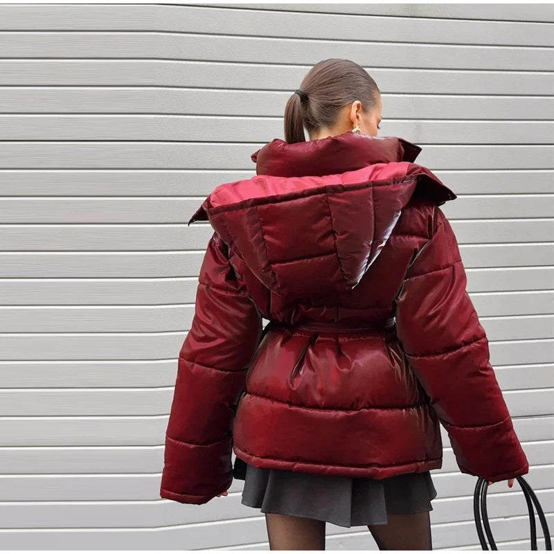 Abrigo mujer vintage brillante 2025. Diseño capucha acolchado, cuello alto puffy, estilo casual. Perfecto invierno. Calidez chic.