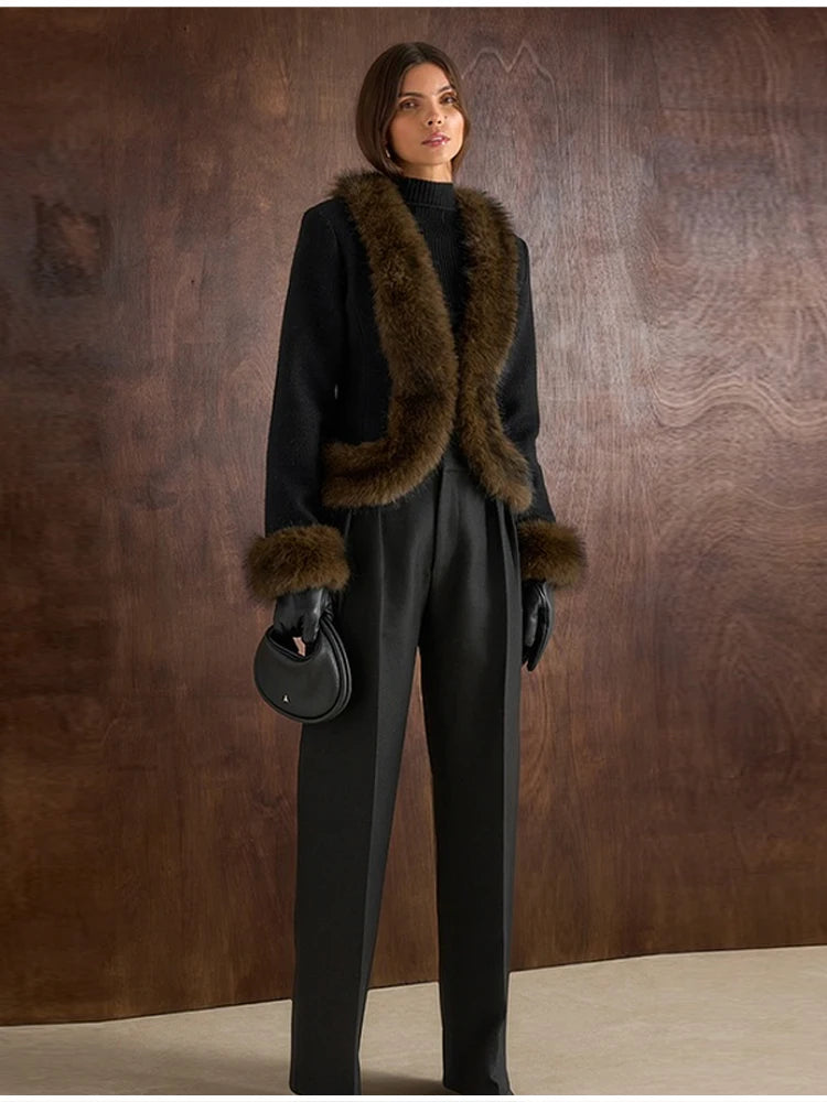 Abrigo mujer elegante cuello piel 2025. Diseño patchwork slim, manga larga desmontable, estilo commute. Perfecto alta calidad. Sofisticación nueva.
