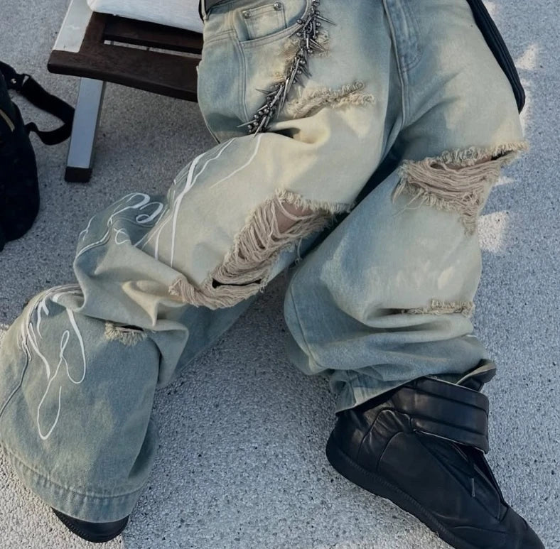 Estilo retro americano con estos jeans Y2K rotos con diseño vintage. Pierna ancha y detalles únicos perfectos para looks streetwear.