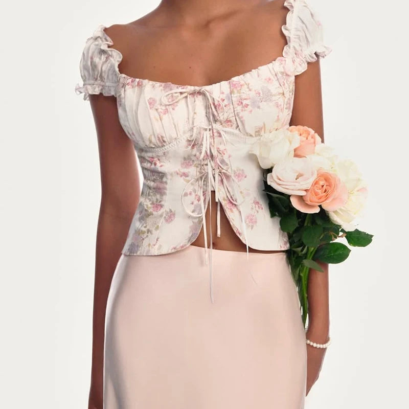 Top Crop Mujer Francés Floral - Top Cordones Cuello V Manga Corta Verano